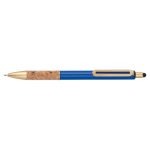 Metal ball pen with golden applications, blue-writing refill and cork grip zone. Your advertising will be engraved to the right of the clip.