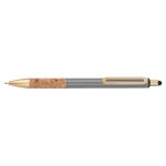 Metal ball pen with golden applications, blue-writing refill and cork grip zone. Your advertising will be engraved to the right of the clip.