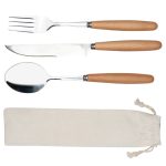 Cutlery set consisting of fork, knife and spoon made of wood and stainless steel in a lockable cotton pouch. Your advertising will be printed on the pouch.