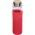 Glass drinking bottle with neoprene sleeve, stainless steel lid with bamboo top, carrying handle and a capacity of 600 ml. Your logo will be printed on the cover.