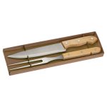 Perfect for meat lovers! Fork and knife with wooden stainless steel handles for slicing roasts, BBQ meat or steaks in an eco-friendly packaging. The logo will be engraved on the blade.