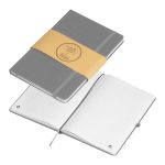 Our recycled PU notebook with 192 lined recycled pages, elastic band to close and pen loop. Your advertising will be printed on the cover.