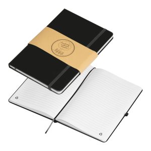 Our recycled PU notebook with 192 lined recycled pages, elastic band to close and pen loop. Your advertising will be printed on the cover.
