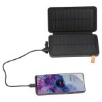 PU solar power bank with hinged cover (second solar panel), hanging loop, light, charging cable and 8,000mAH power. Your logo will be printed on the cover.