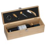 Wine box made of light wood with integrated waiter’s knife, bottle stopper, pourer and drip ring in the lid. The additional wooden bracket holds the bottle securely in the box. Your logo will be engraved on the box.